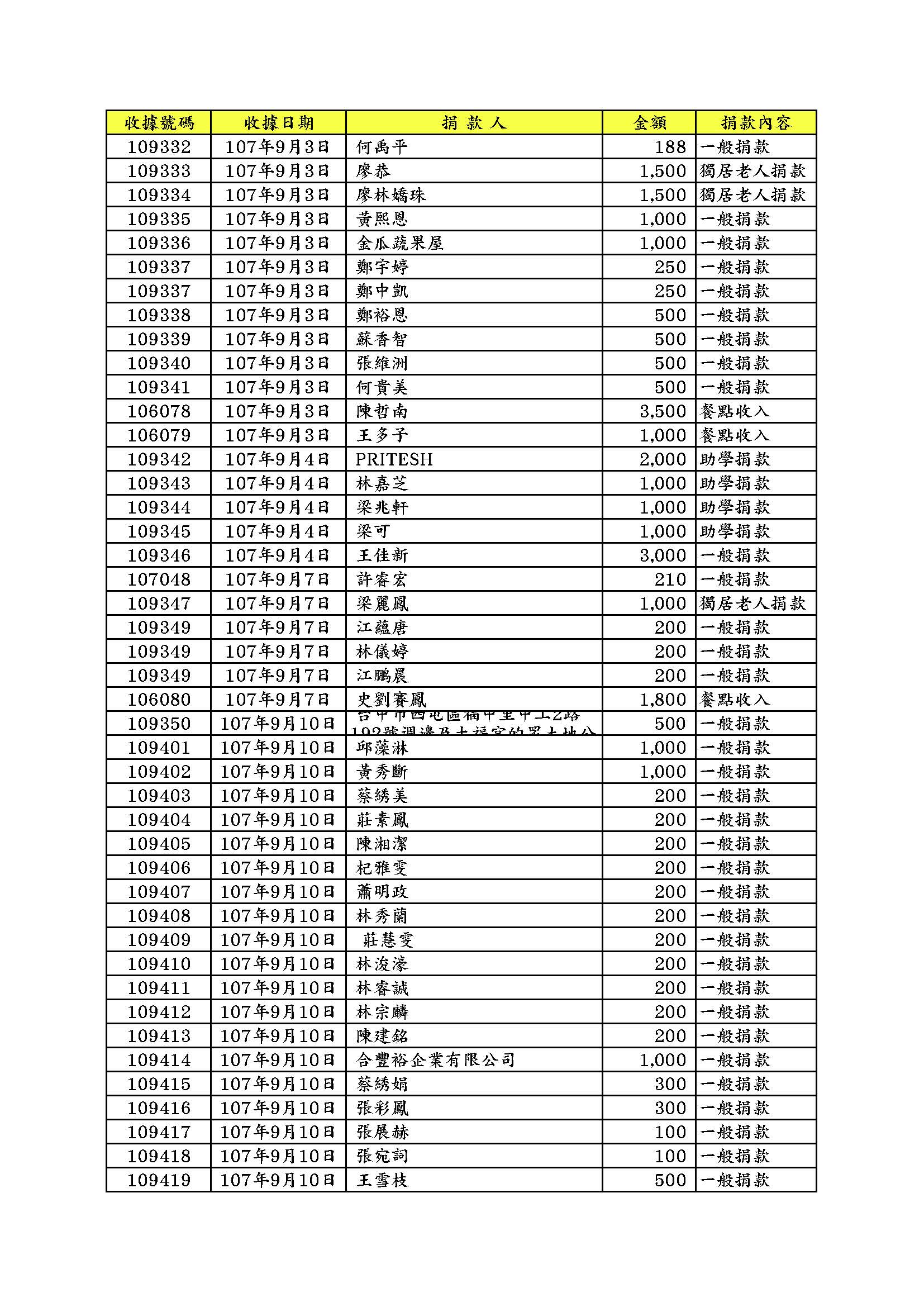 107年9月份捐款名錄