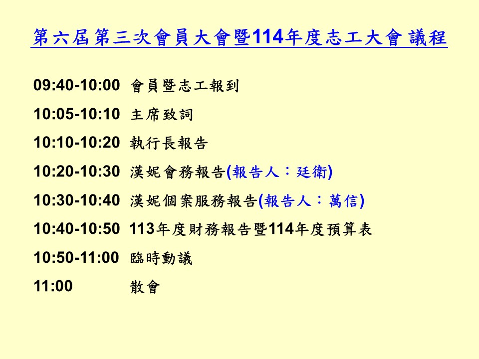 社團法人台中市漢妮之家公益發展協會於114年11月16日〈星期日〉上午10時00分至11時00分召開第六屆第三次會員大會,順利圓滿結束。
