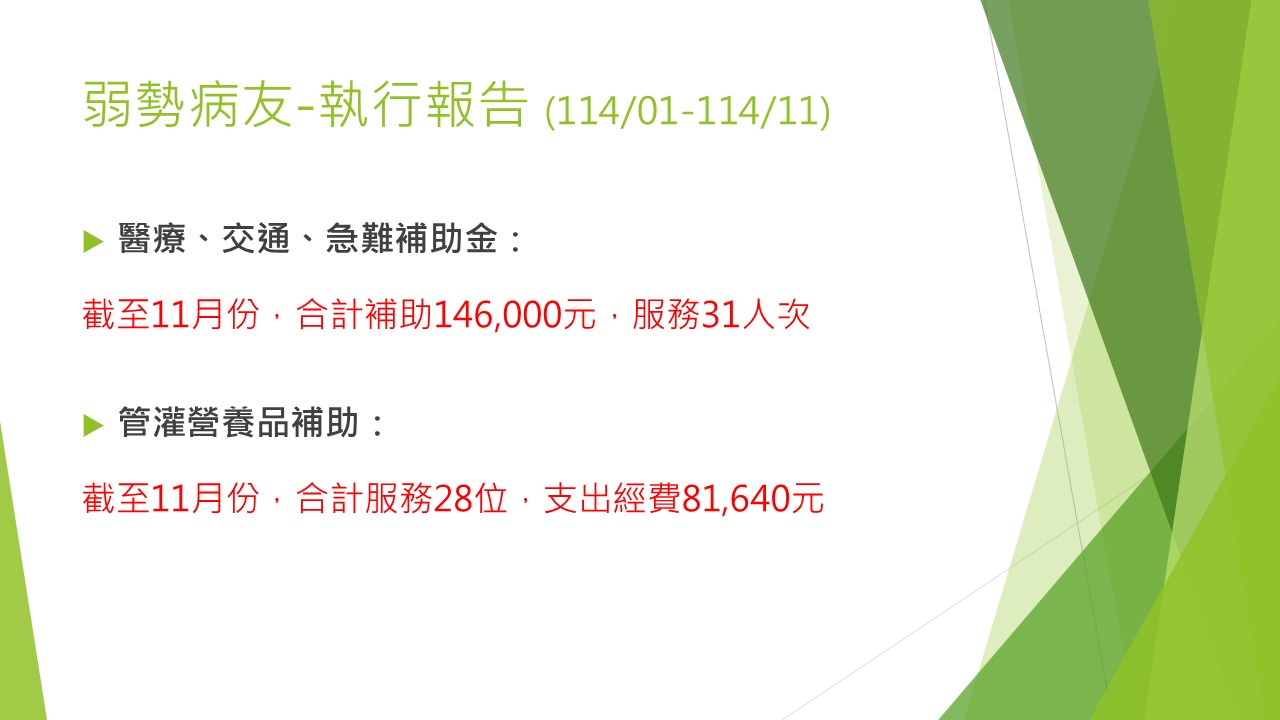 - 管灌營養品個案:60位,累計支出經費119,250元